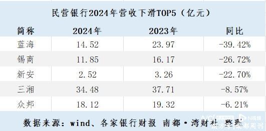 从营收变化的角度来看,营收降幅最为剧烈的5家银行分别为蓝海银行、锡商银行、新安银行、三湘银行、众邦银行。其中,蓝海银行的营收降幅最大,达到了39.42%,锡商银行和新安银行则达到了两位数的降幅,前者为26.72%,后者为22.70%。三湘银行和众邦银行的营收降幅在个位数内,较前三者而言,相对较小。
