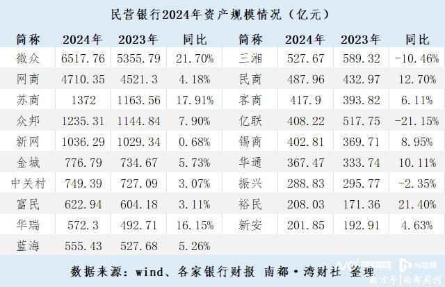 就增长角度来看,19家民营银行的总资产在2024年末达到了21459.3亿元,较2023年末增长了9.49%。具体来看,19家民营银行中,有16家实现了正增长,剩余3家则出现了“缩表”,他们分别为振兴银行、三湘银行、亿联银行。